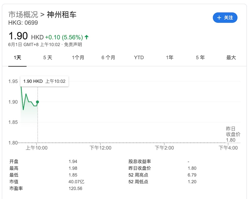 神州租车一度涨近 8%,到发稿涨幅为 5.56%。