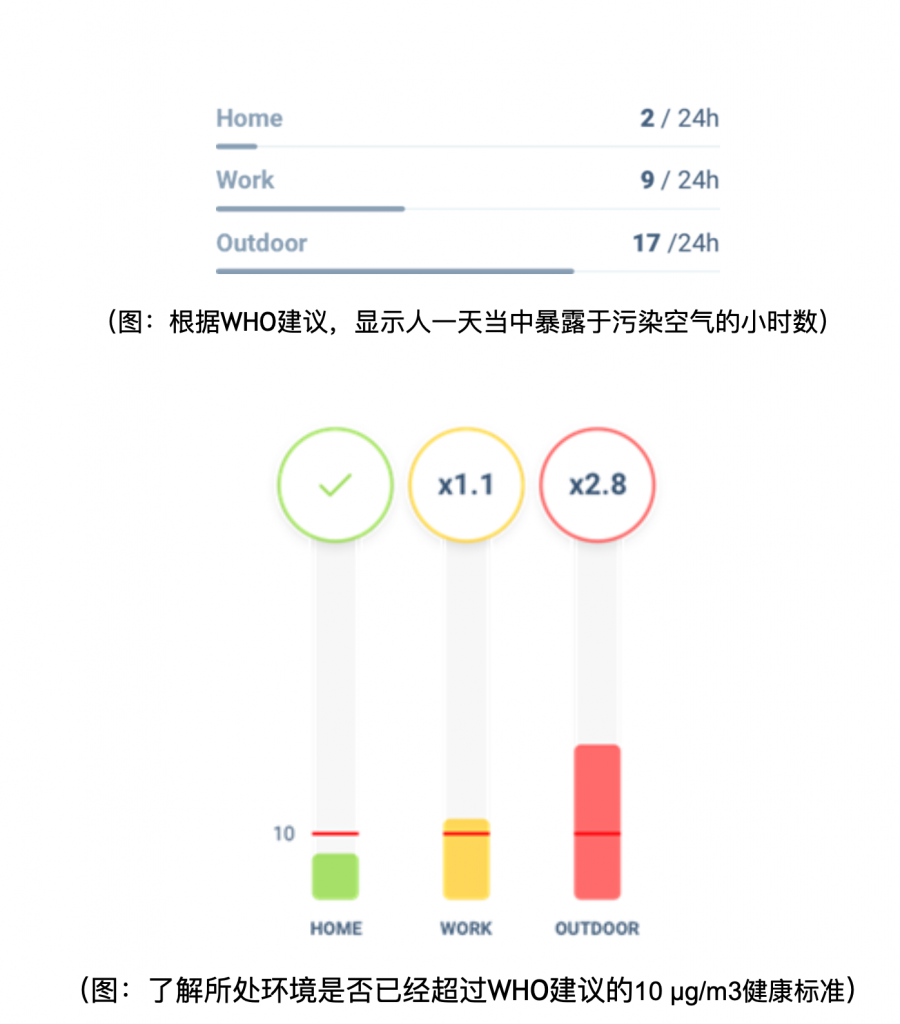 空气质量App上线,增加了个人空气污染露出值功。该功用归纳了世界卫生组织(WHO)的空气质量和健康攻略规范,以及人们每天露出于空气污染中的状况,致力于为用户供给随时随地的健康主张。(世界卫生组织发布的每天和每年PM2.5露出值的主张规范,即:日均匀浓度25 µg/m3以内,年均匀浓度10 µg/m3以内)。新页面能检查人们最常见的三个场景——住所、办公室和室外环境里,每小时的污染露出状况。