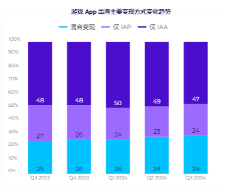 我国手游出海的首要变现方法在曩昔五个季度出现出显着的改变趋势。首要,混合变现方式出现继续添加趋势,从 2023 年 Q3 的 25% 添加至 2024 年 Q3 的 29%。这标明越来越多的手游开发者挑选经过广告收入(IAA)和使用内付费(IAP)相结合的方法来获取收益。