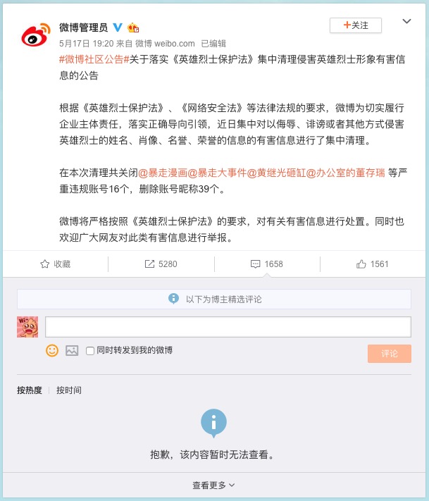 5 月 17 日发布公告称,依据《英豪勇士维护法》、《网络安全法》等法律法规,已封闭包含暴走漫画、暴走大事情