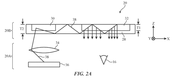 从而看后面的专利说明书,仍是咱们常见的波导计划的描绘办法,差异于FIG.2B的外表工艺,FIG.2A展现的是内嵌工艺的耦入耦出分块。图形显现36的画面光线经过透镜(组)34改换后,输入到耦入部分30中,经过耦入部分的偏折,从而在波导片中折叠传达,终究经过耦出部分32的再次偏折进入人眼16.